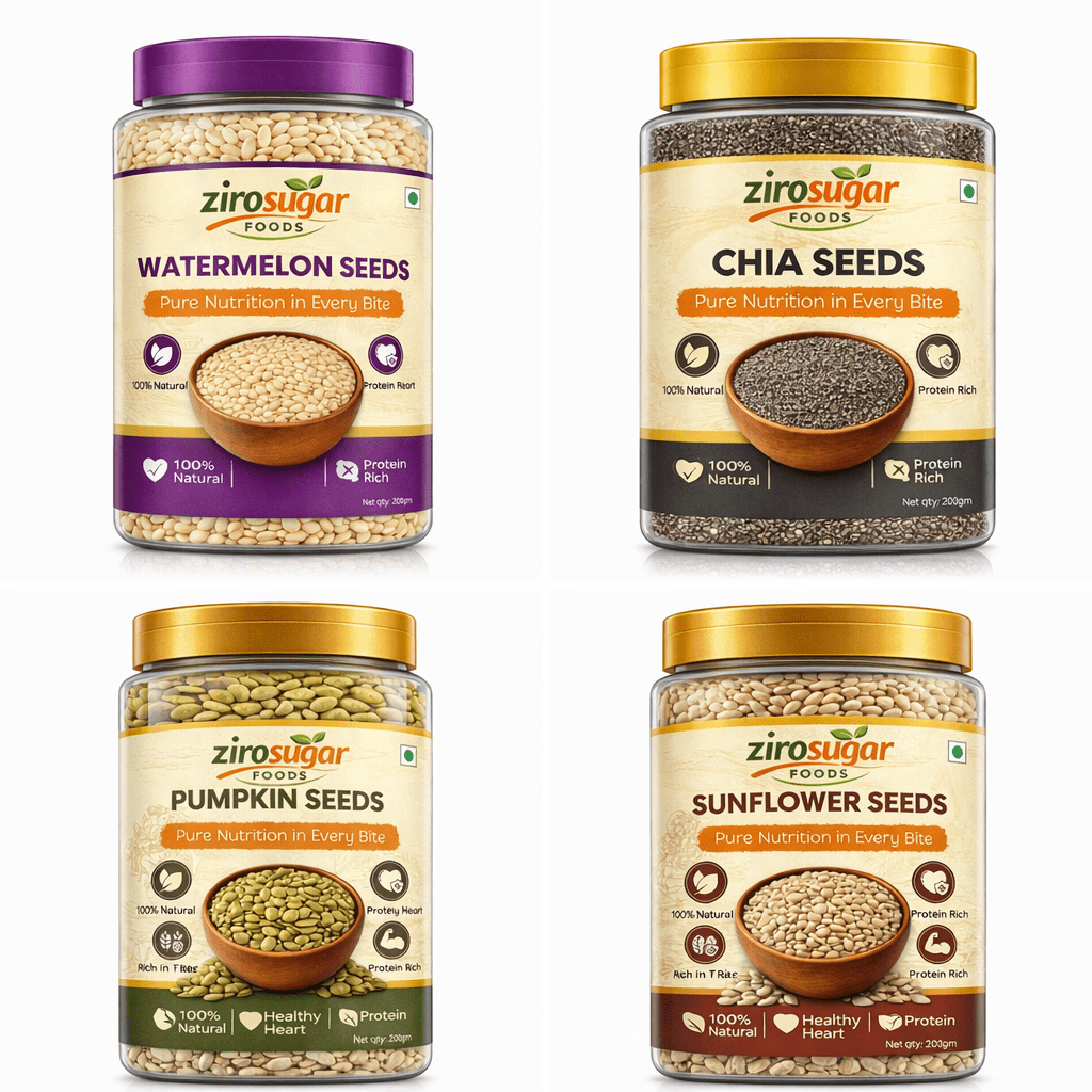 Looking for a healthy seeds combo? The Ziro Sugar 4-in-1 seeds combo includes chia seeds, pumpkin seeds, sunflower seeds, and watermelon seeds.